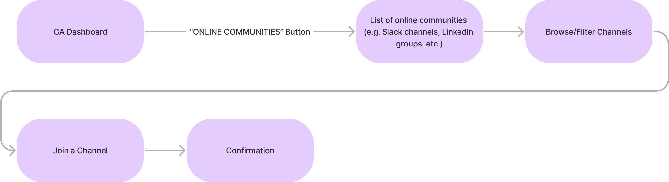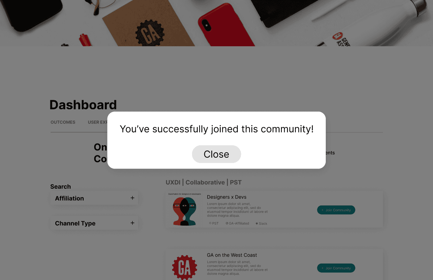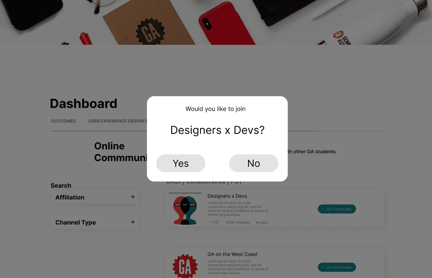 Taking the time constraint of this sprint into account, our team decided to built upon and improve what already existed instead of starting from scratch. Our proposed solution was to create an additional tab in GA’s student portal that led them to a filterable list of existing GA communities. From that page, students would be able to easily find a community that is right for them and foster meaningful connections.